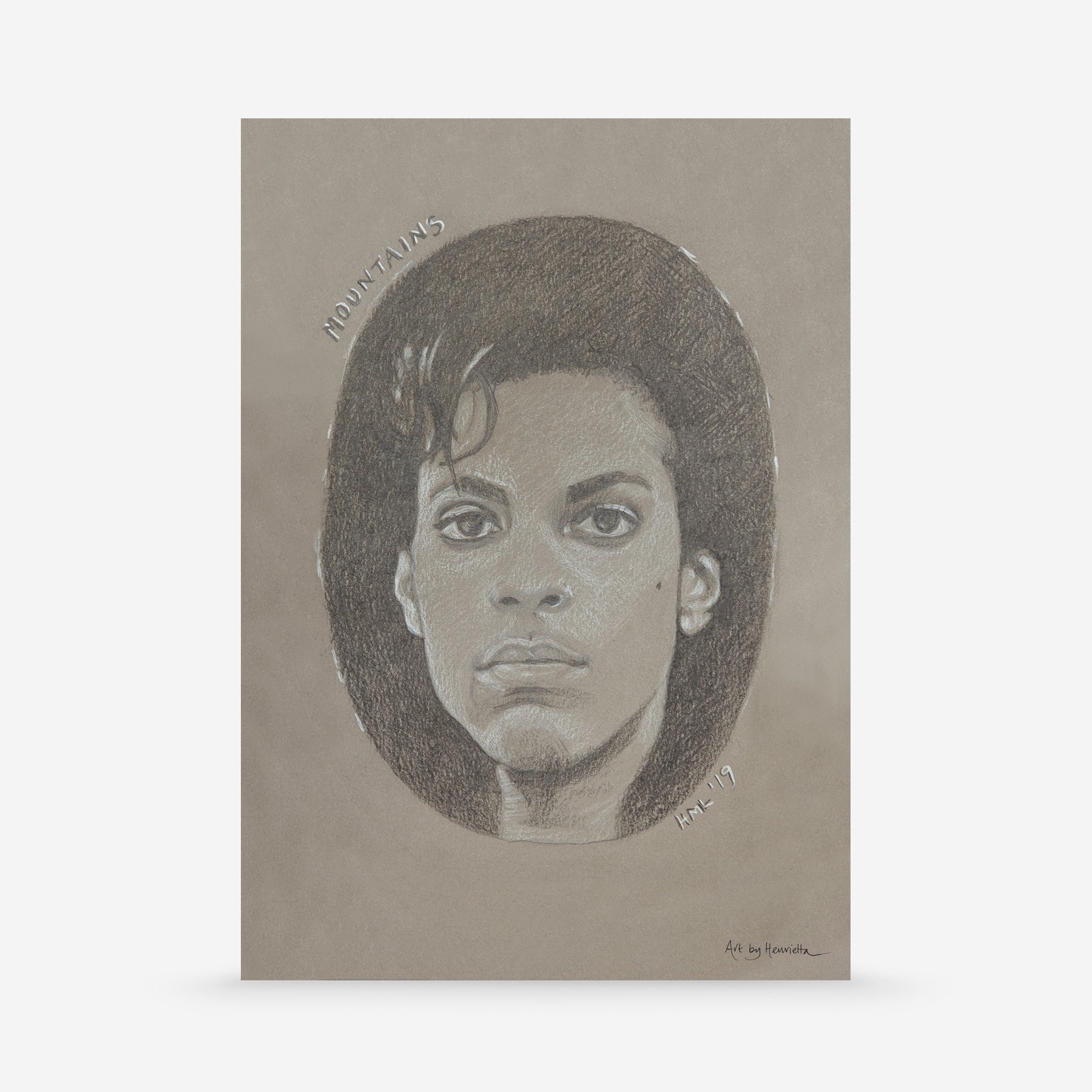 A Fine Art print of a graphite and white charcoal drawing on toned grey Strathmore paper.